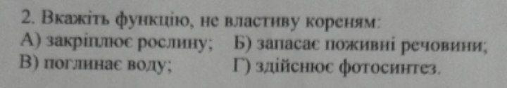 вкажіть функцію, не властиву кореню А) закріплю рослину В) поглинає воду Б) запасає поживні речовину Г) здійснює фотосинтез