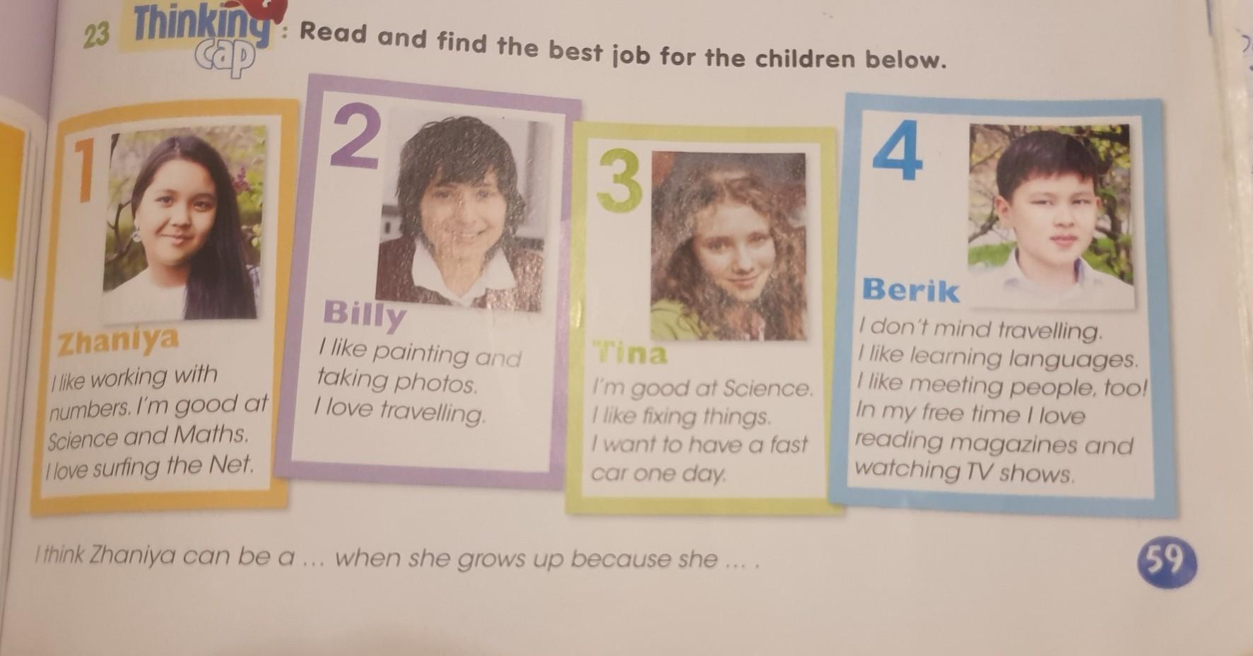 23 Thinking: Read and find the best job for the children below. cap 2 4 1 31 Zhaniya I like working with numbers. I'm good at Science and Maths. I love surfing the Net. Billy I like painting and taking photos. I love travelling. Tina I'm good at Science. I like fixing things. I want to have a fast car one day. I think Zhaniya can be a ... when she grows up because she .... Berik I don't mind travelling. I like learning languages. I like meeting people, too! In my free time I love reading magazines and watching TV shows. 59
