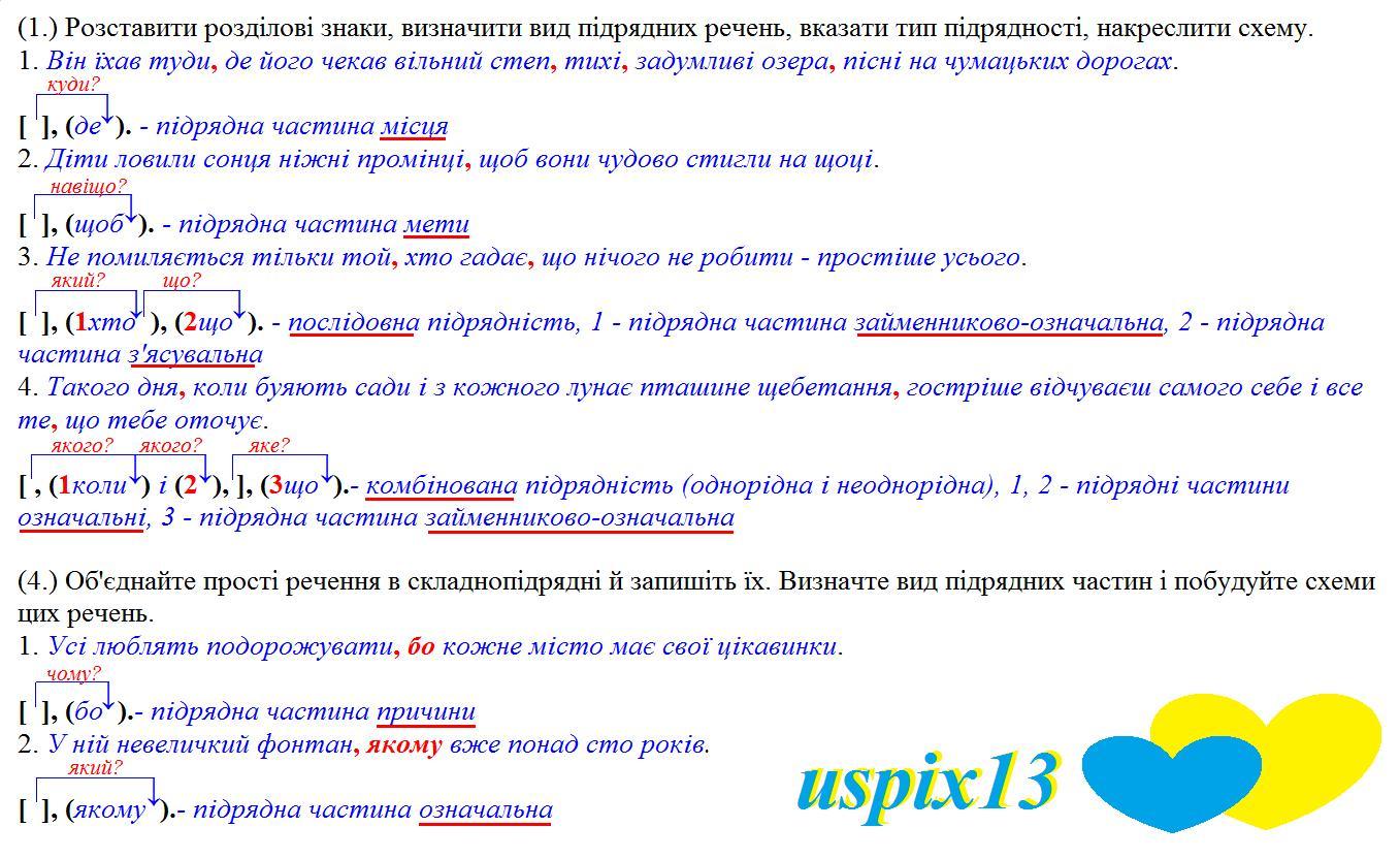 (4.) Об'єднайте прості речення в складнопідрядні й запишіть їх. Визначте вид підрядних частин і побудуйте схеми цих речень.