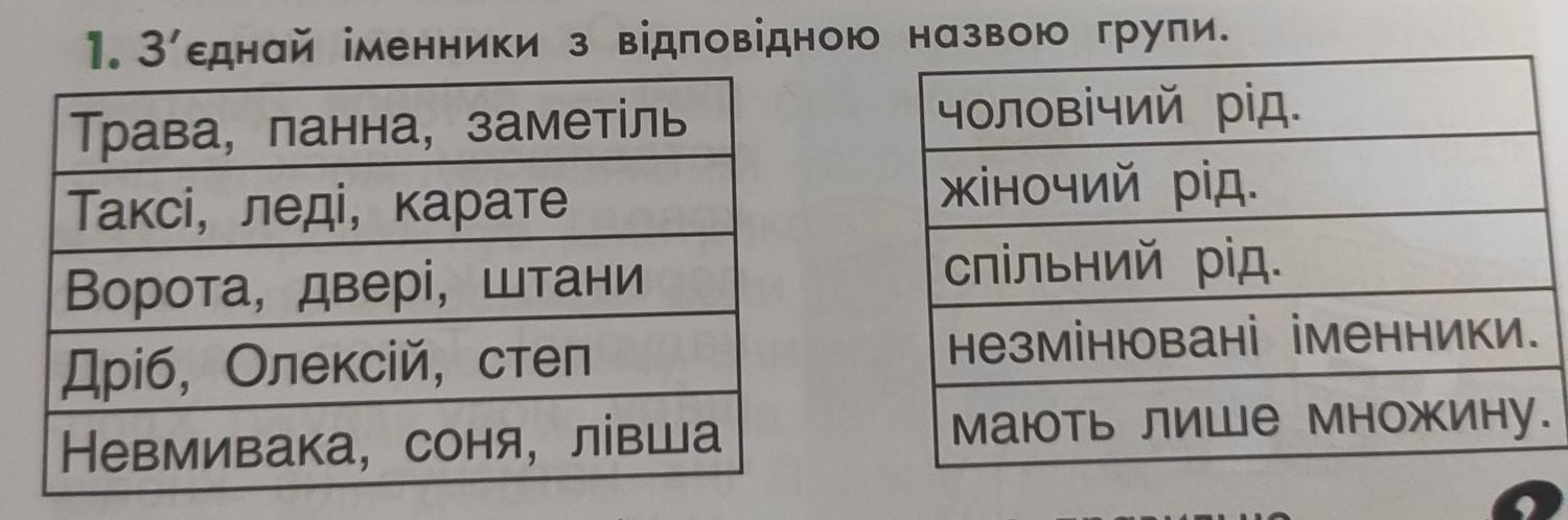 1. З'єднайменники з відповідною Трава, панна, заметіль Таксі, леді, карате Ворота, двері, штани Дріб, Олексій, степ Невмивака, соня, лівша назвою групи. чоловічий рід. жіночий рід. спiльний рiд. незмінювані іменники. мають лише множину.