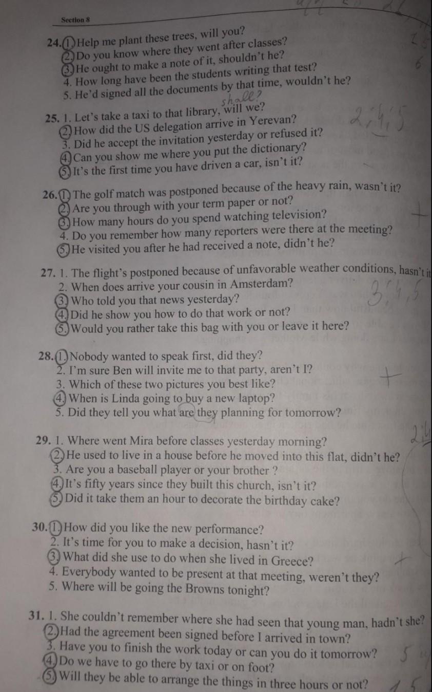 Тема: Вопросительные предложения. Я карандашом отметила правильные варианты, не отмеченные - неправильные. Найдите ошибки в этих предложениях и, пожалуйста, скажите мне, что не так, я буду очень благодарна.