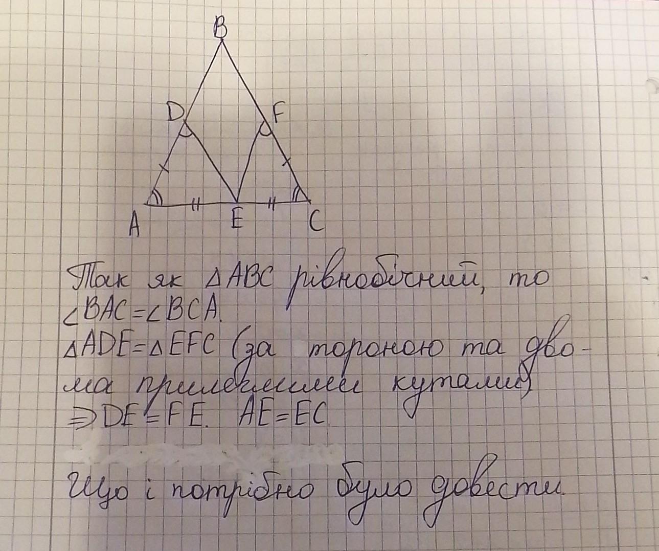 АВ=ВС (по условию), значит треуг.АВС - равнобедренный. <А=<С ( как углы при основании равнобедренного треугольника). => треуг. АDE=треуг. СFE (по второму признаку равенства треугольников, по сторонеи двум прилежащим к ней углам). Отсюда следует, что АЕ=ЕС, Е - середина АС. Что и требовалось доказать