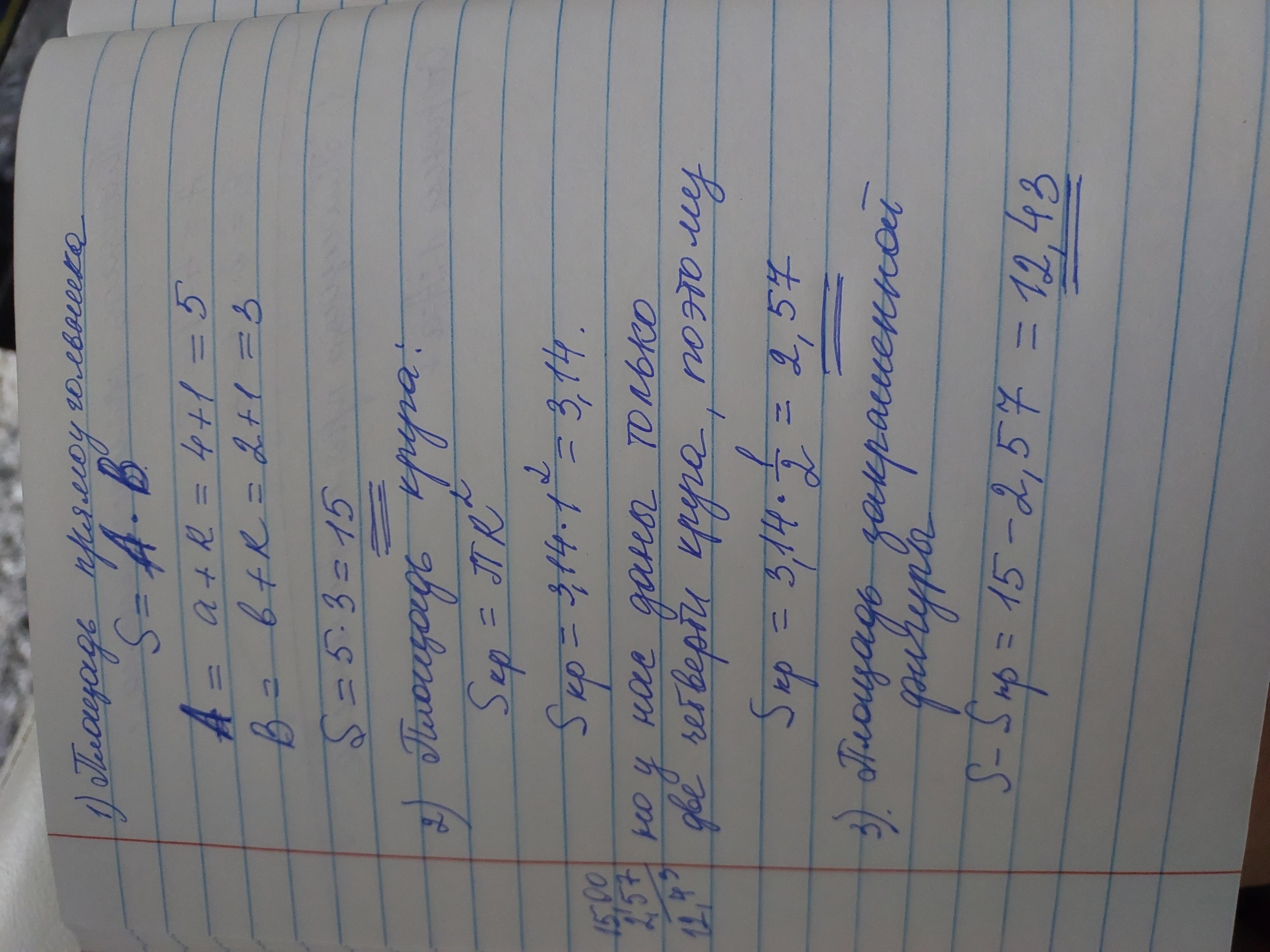 Sabcd = a*b = 10, тепер віднімем площу білих кругів, S круга = pr^2 = 3,14