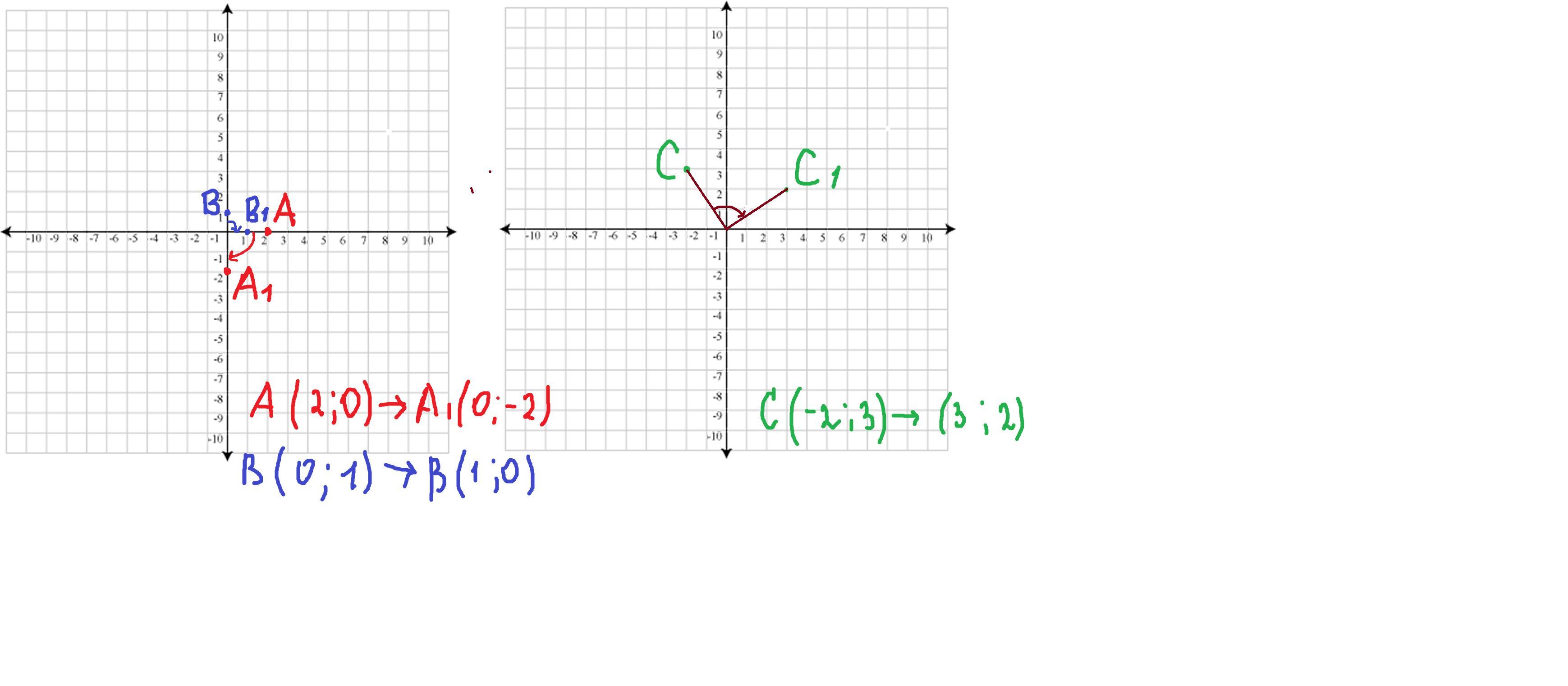 даны точки А(2;0),В(0;1),С(-2;3) изобразите точки полученные при повороте данных точек на 90° относительно начала координат по часовой стрелке