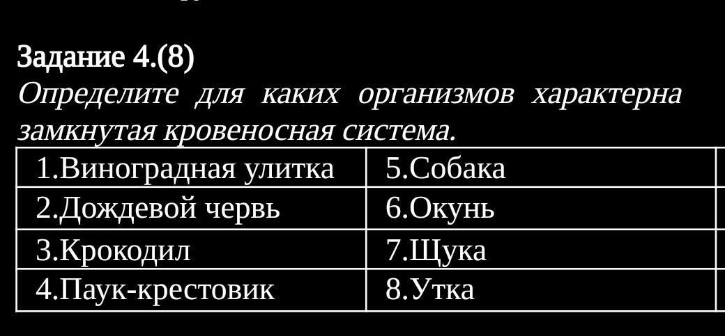 Задание 4.(8) Определите для каких организмов характерна замкнутая кровеносная система. 1. Виноградная улитка 2.Дождевой червь 3.Крокодил 4.Паук-крестОВИК 5.Собака 6.Окунь 7.Щука 8.Утка