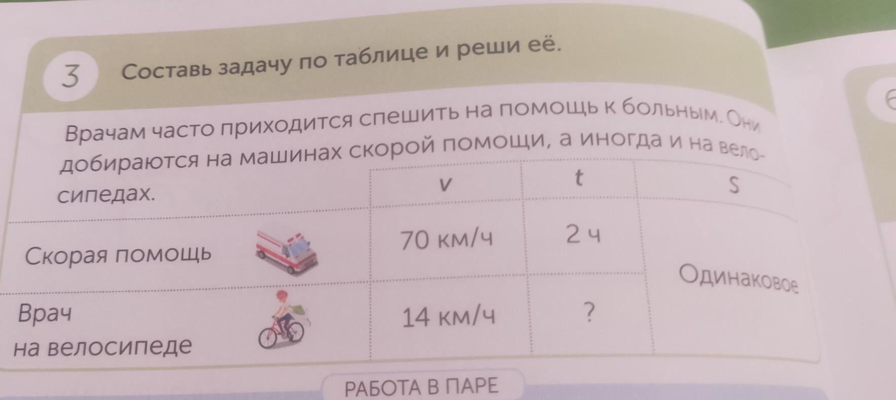 Урок 75 - Задана дие в противоположных направлениях Составь задачу по таблице и реши её Врачам часто приходится спешить на помощь к больным. Они добираются на машинах скорой помощи, а иногда и на вело- S сипедах 3 Скорая помощь Врач на велосипеде 70 км/ч 14 км/ч РАБОТА В ПАРЕ 24 7? Одинаковое жпжпж фото да урока час