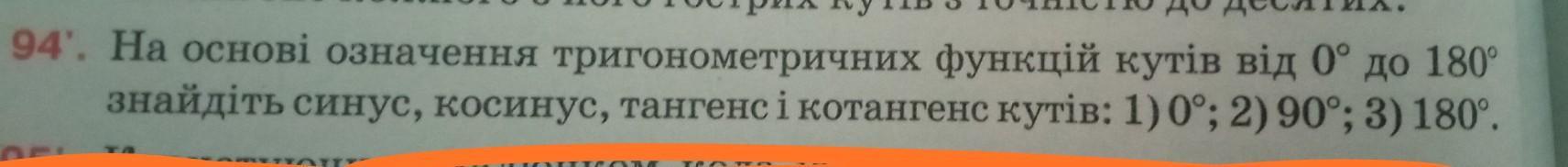 2) sin90° = 1/1= 1 ; cos90° = 0/1 = 0 ; tg0° = 1/0 - не існує ;