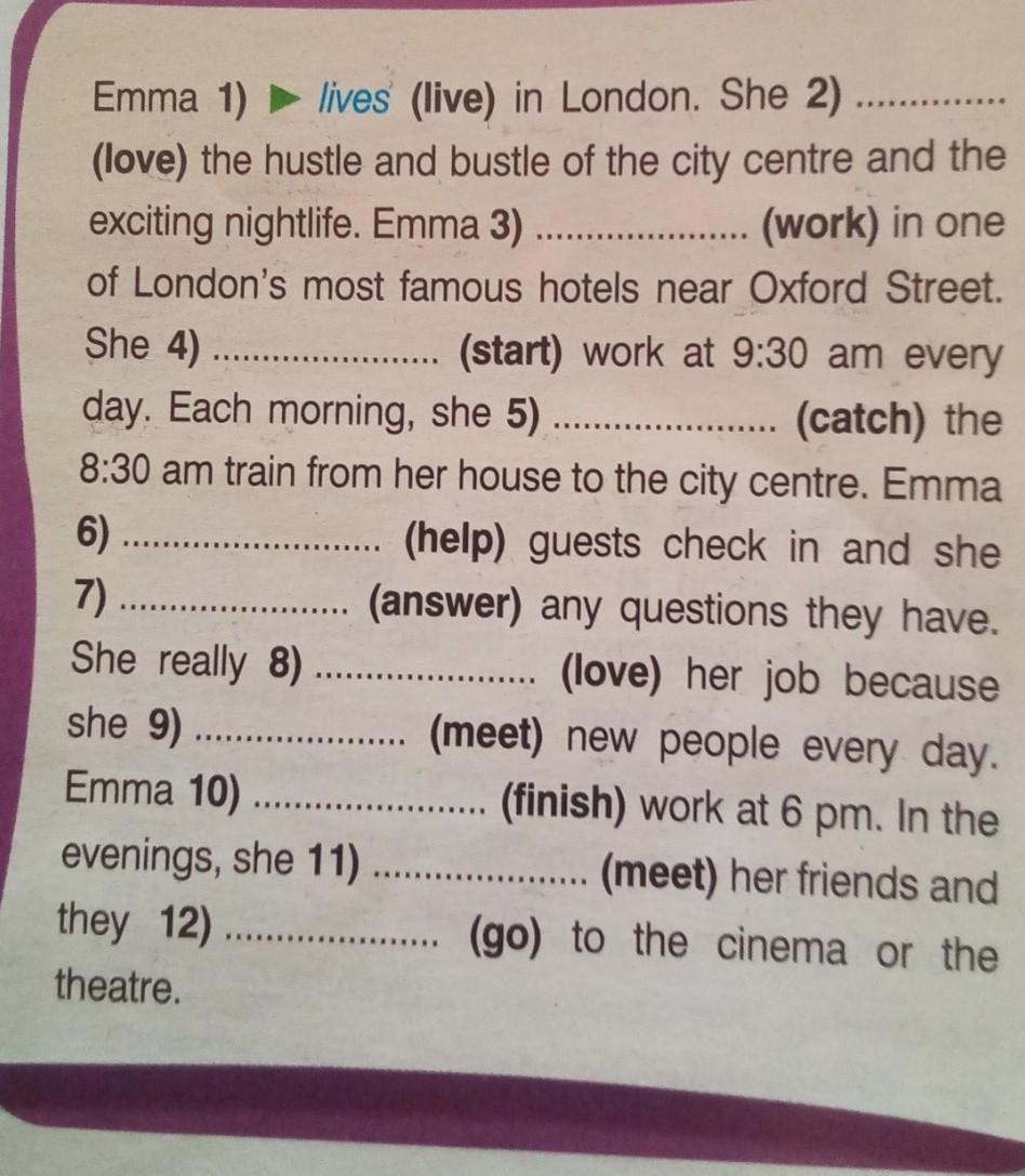 Emma 1) lives (live) in London. She 2) (love) the hustle and bustle of the city centre and the exciting nightlife. Emma 3) ...................... (work) in one of London's most famous hotels near Oxford Street. She 4).... .............. (start) work at 9:30 am every day. Each morning, she 5) .... ............. (catch) the 8:30 am train from her house to the city centre. Emma 6) ................... (help) guests check in and she (answer) any questions they have. (love) her job because 7) She really 8)...... she 9)...................... (meet) new people every day. Emma 10) ......... (finish) work at 6 pm. In the evenings, she 11) (meet) her friends and they 12)......................(go) to the cinema or the theatre.
