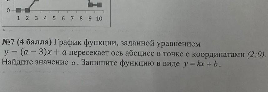 График функции, заданной уравнением y = (a-3) x+ а пересекает ось абсцисс в точке с координатами 2;0 (Найдите значение а. Запишите функцию в виде у = kx + b.