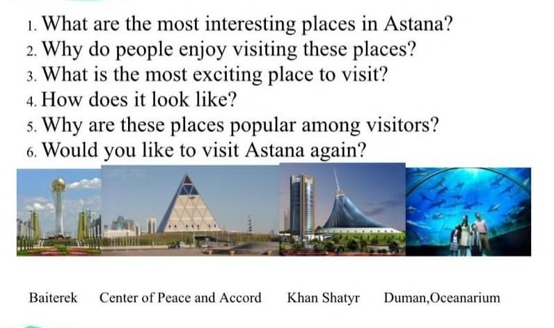 1. What are the most interesting places in Astana? 2. Why do people enjoy visiting these places? 3. What is the most exciting place to visit? 4. How does it look like? 5. Why are these places popular among visitors? 6. Would you like to visit Astana again? Baiterek Center of Peace and Accord Khan Shatyr Duman, Oceanar