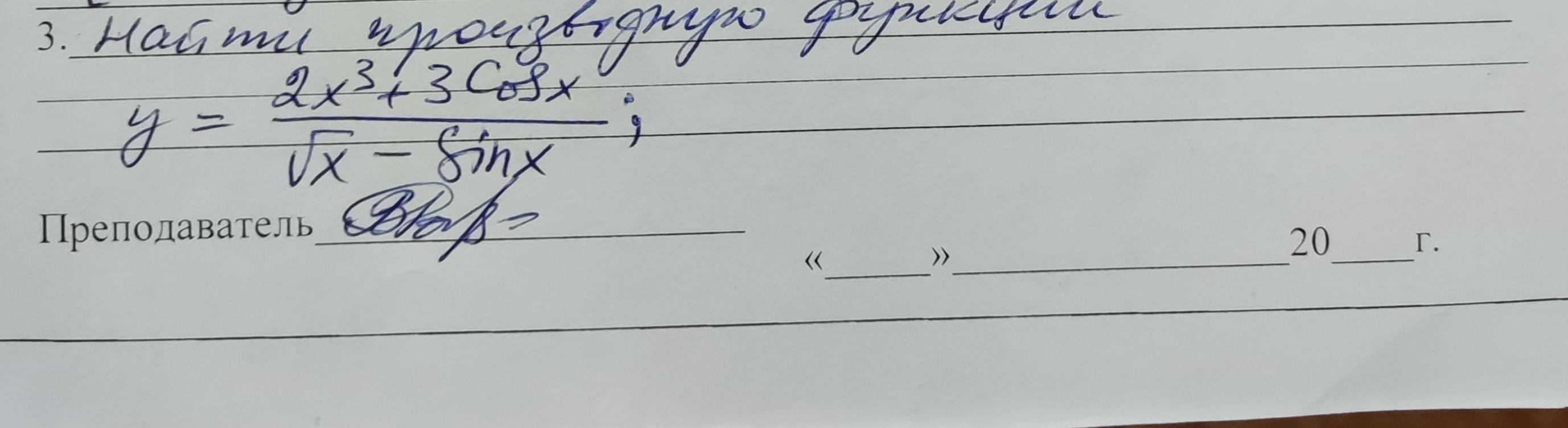 у'= (2х³+3соsx/√x-sinx)'= 3*2x²-3sinx/x½ -cosx= 6x²-3sin/½x-½+cosx