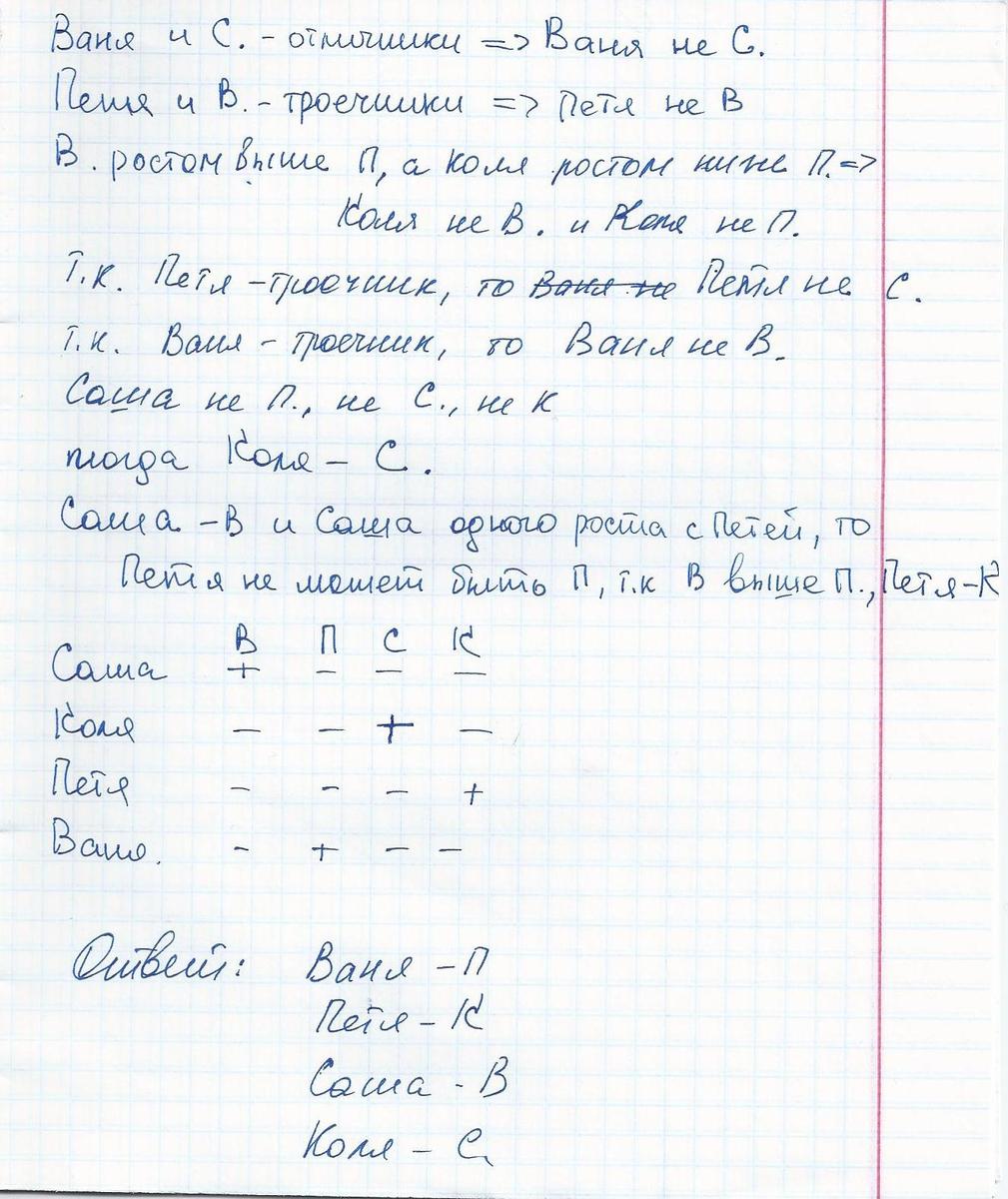 решите логическую задачу .- Ваня ,Петя ,Саша и Коля носят фамилии , начинающиеся на буквы В, П , С, и К.известно ,что :