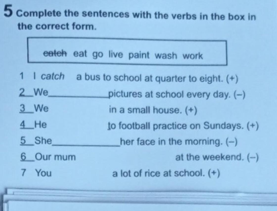 a bus to school at quarter to eight. (+)