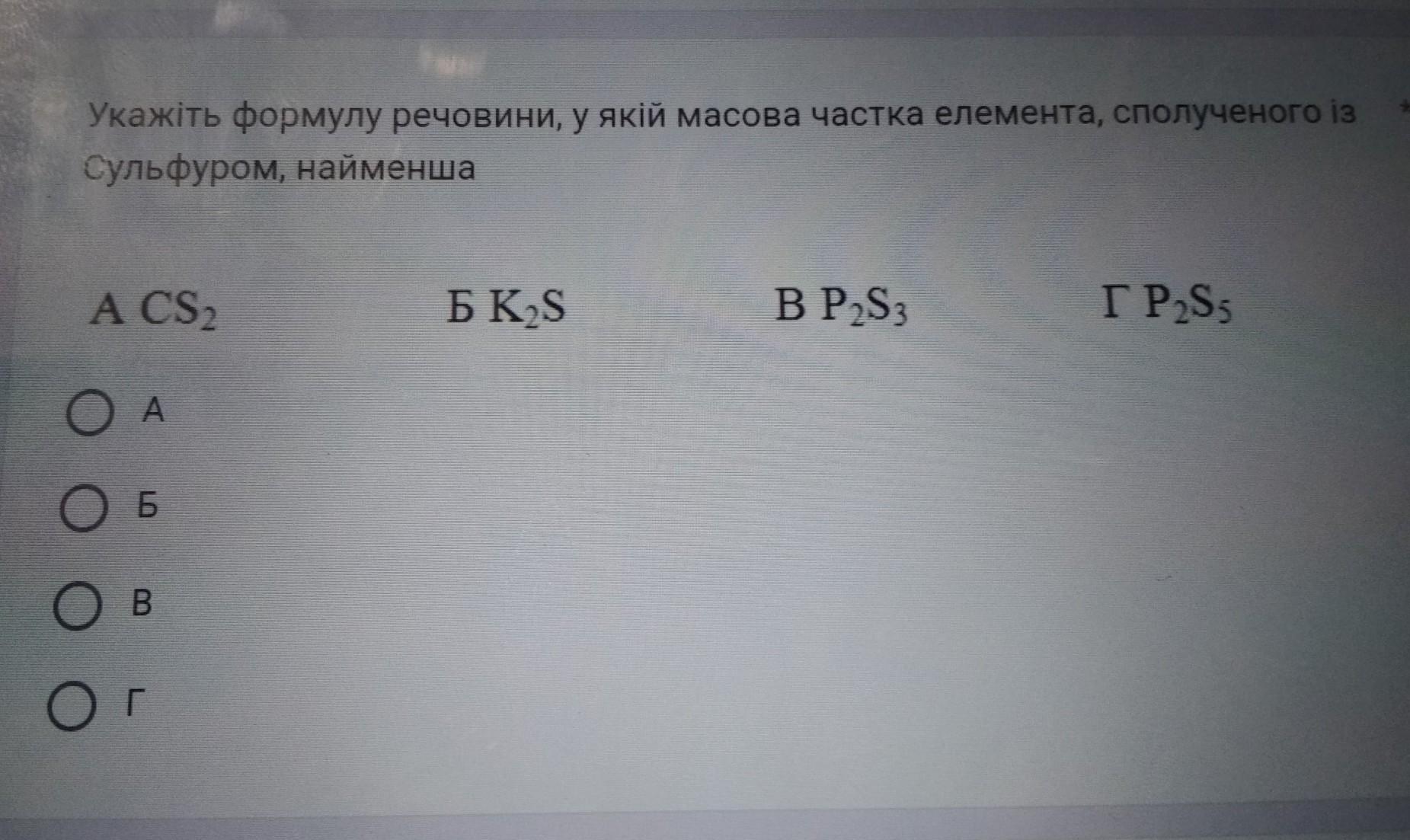 Укажіть формулу речовини, у якій масова частка елемента сполученого із Сульфором найменша А CS2, Б K2S, B P2S3, Г P2S5. Срочно!!!!!!