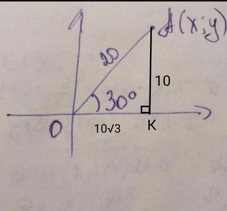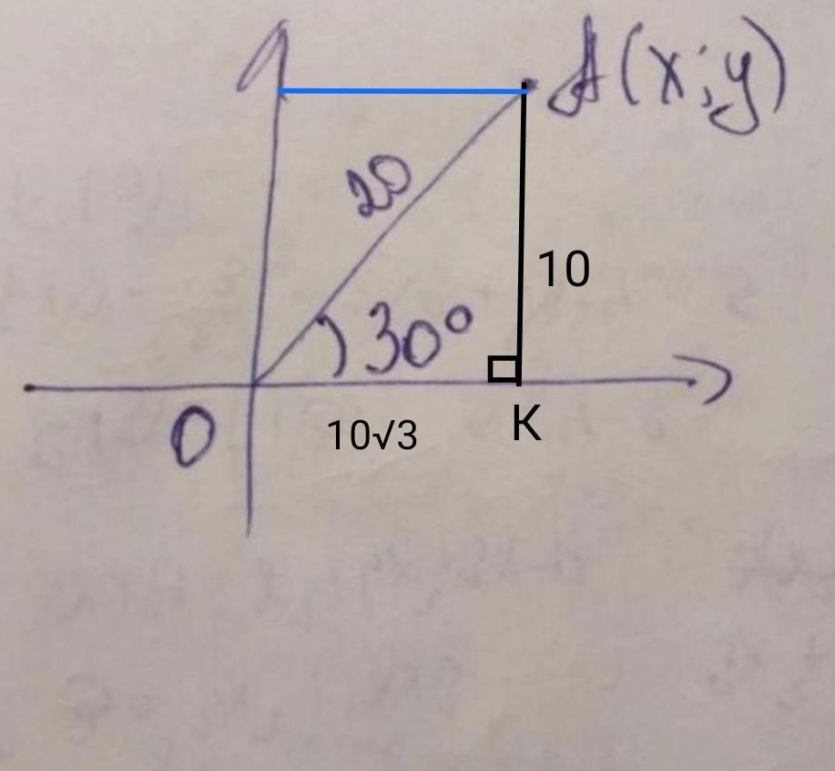 ОК=√(АО²-АК²)=√(20²-10²)=10√3 - абцисса будет 10√3.