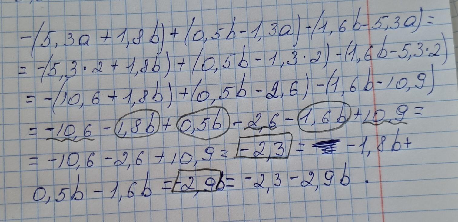 3. Раскройте скобки и приведите подобные слагаемые в выражени - (5.3a + 1.8b) + (0.5b-1.3a)-(1.6b-5.3a) и найдите его значение при а=2