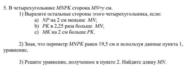 2.зная что периметр MNPK равен 19.5 и используя данные пункта 1, составьте уравнение (там просто не видно что написано и я решила вам написать)