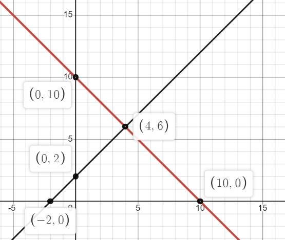 Находим точки и проводим линии. Точка пересечения (4;6) дает нам решение системы. (См. скриншот)