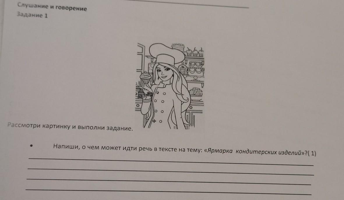 Слушание и говорение Задание 1 Рассмотри картинку и выполни задание. Напиши, о чем может идти речь в тексте на тему: «Ярмарка кондитерских изделий ?