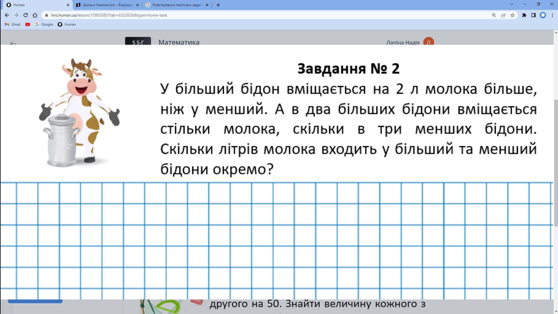 Пусть в маленький бидон помещается x литров молока, тогда в большой x+2по условию:2 * (x+2) = 3 * x2x + 4 = 3xx = 4x+2 = 6Ответ: в большой бидон 6 литров, в маленький 4 литра