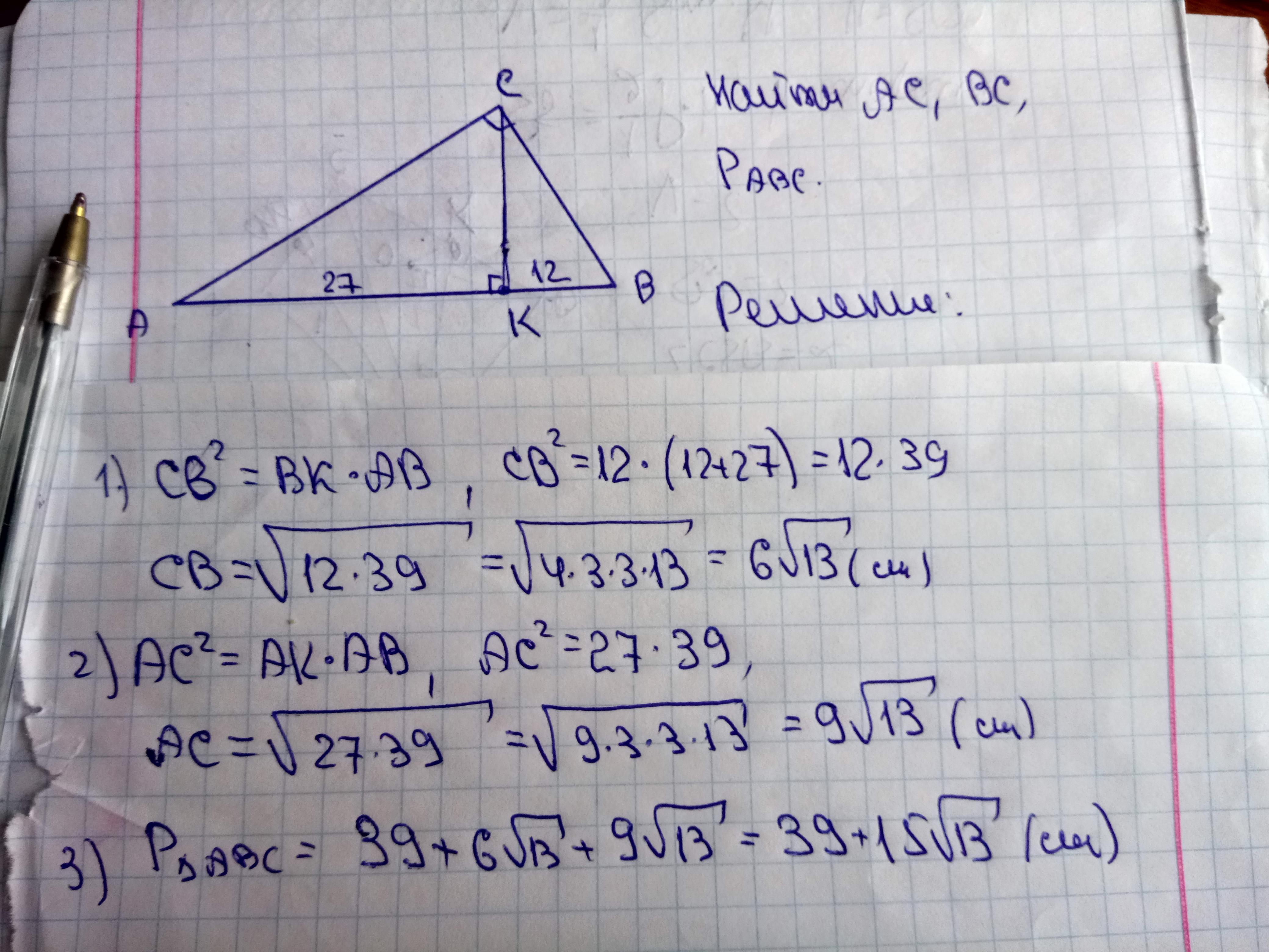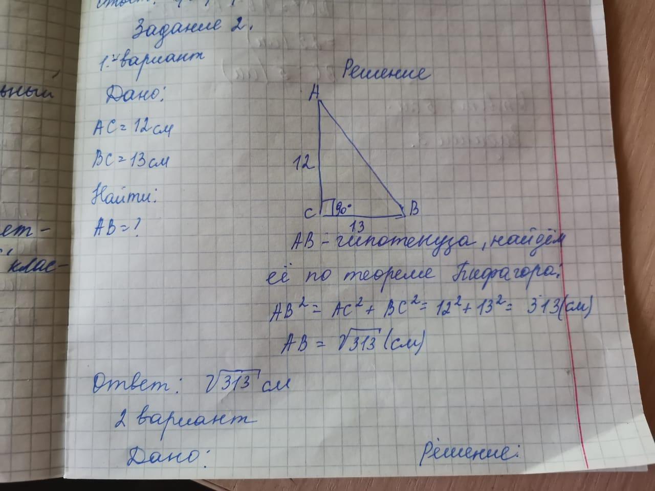 ВАРИАНТ 1 1.В прямоугольном треугольнике АВС угол С прямой, катеты равны 12 см и 16 см. Найдите косинус и синус угла В. 2.Стороны прямоугольного треугольника равны 12 см и 13 см. Найдите третью сторону треугольника. Рассмотрите все возможные случаи. 6 3.В прямоугольном треугольнике ABC cosa= √37 а) вычислите tg a; б) используя значение тангенса, постройте угол а. 4.Высота СК прямоугольного треугольника АВС, проведенная к гипотенузе, делит ее на отрезки длиной 8 см и 32 см. 5. Найдите катеты и периметр треугольника. В равнобедренном треугольнике ABC с основанием АС боковая сторона АВ равна 18 см, а высота BD, проведенная к основанию, равна 9√3 см. Найдите основание и периметр треугольника