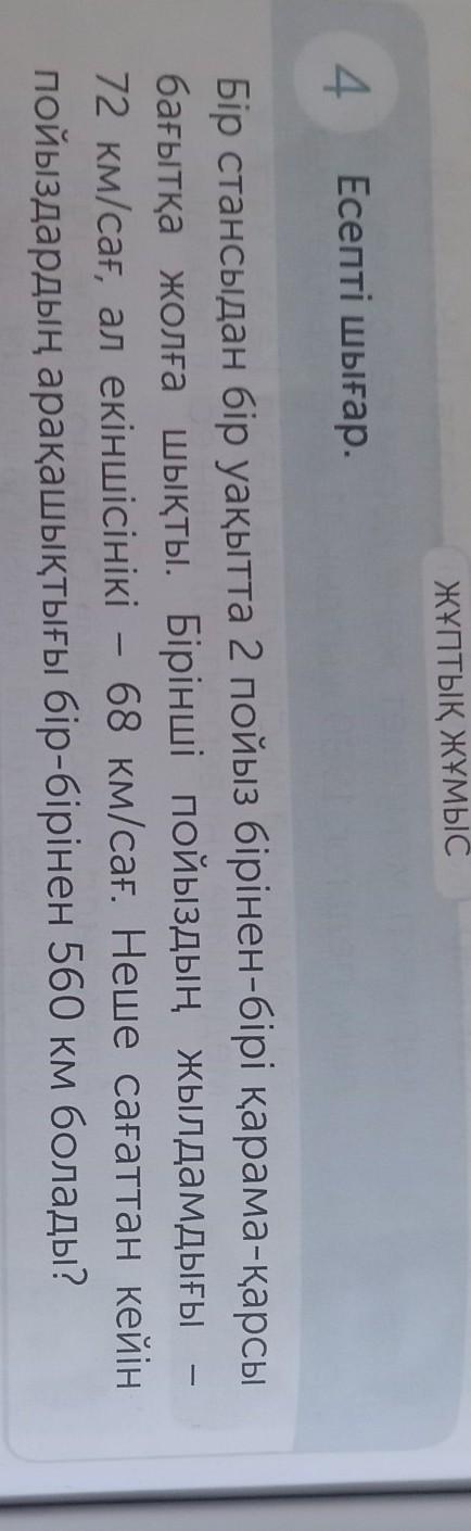 Бір стансыдан бір уақытта 2 пойыз бірінен-бірі қарама-қарсы бағытка жолға шықты. Бірінші пойыздың жылдамдығы 72 км/сағ, ал екіншісінікі — 68 км/сағ. Неше сағаттан кейін пойыздардың арақашықтығы бір-бірінен 560 км болады? -