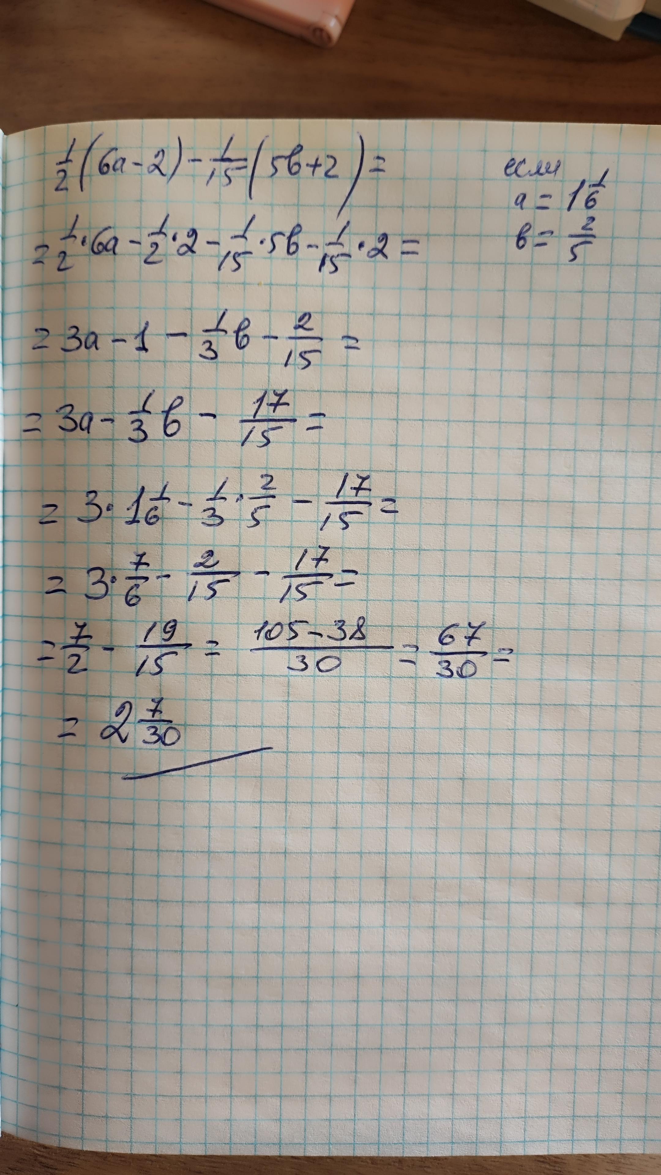 1/2(6a-2) - 1/15(5b + 2) при а 1 1/6 b=2/5