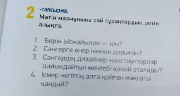 2 -тапсырма. Мәтін мазмұнына сай сұрақтардың ретін анықта. 1. Берiк Ысмайылов - кiм? 2. Сәнгерге өнер кiмнен дарыған? 3. Сәнгердiң дизайнер-конструкторлар дайындайтын мектебі қалай аталады? 4. Ісмер жiгiттің алға қойған мақсаты кандай?