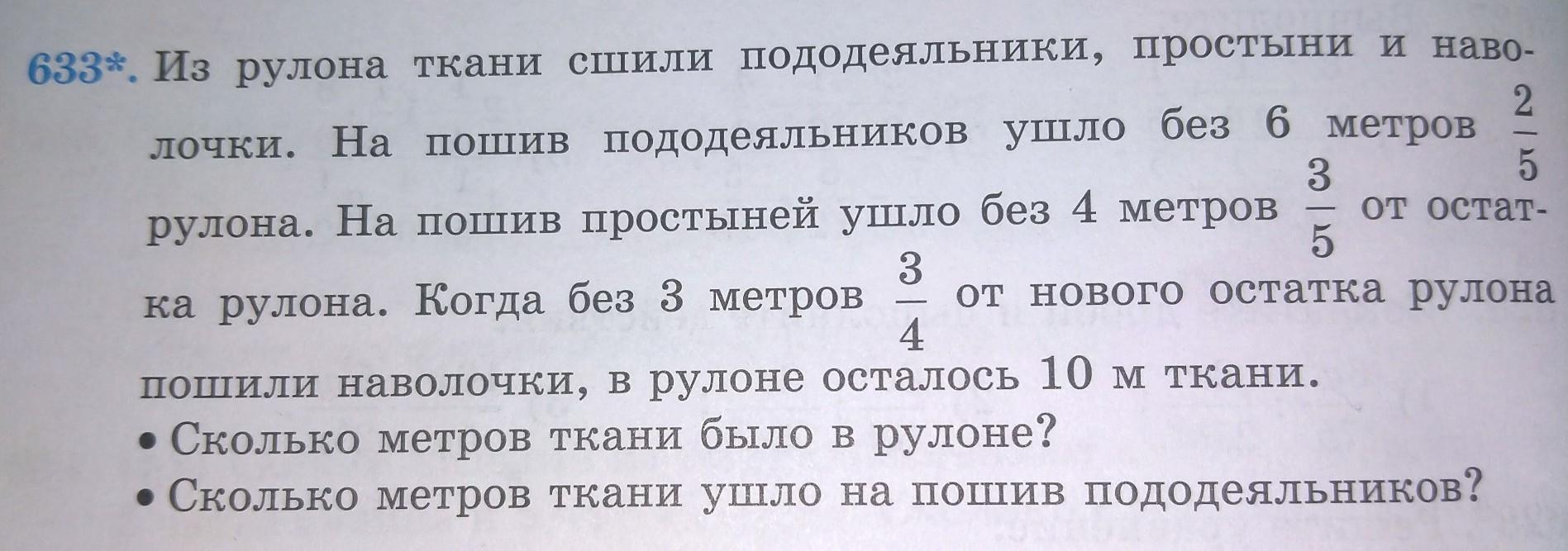 Ушло на простыни = 3/5 * (3/5х + 6) - 4 = 9/25х + 18/5 - 4 = 9/25х + 3 3/5 - 4 = 9/25х - 2/5 м