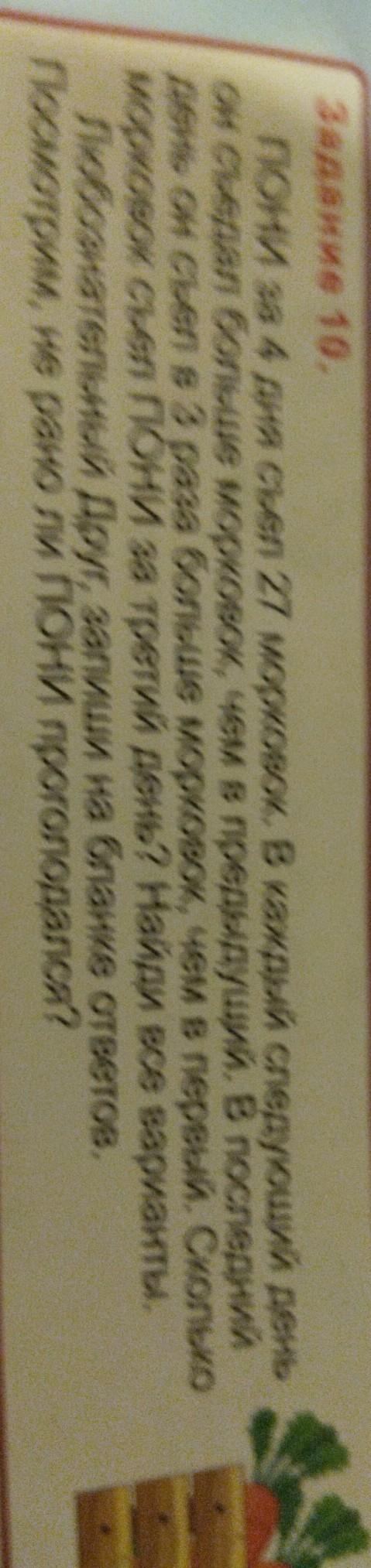пони за 4 дня съел 27 морковок в каждый следующий день он всегда больше морковок чем предыдущий в последний день он съел в три раза больше морковок чем в первой сколько сколько мозгов съел пони за третий день Найди все варианты