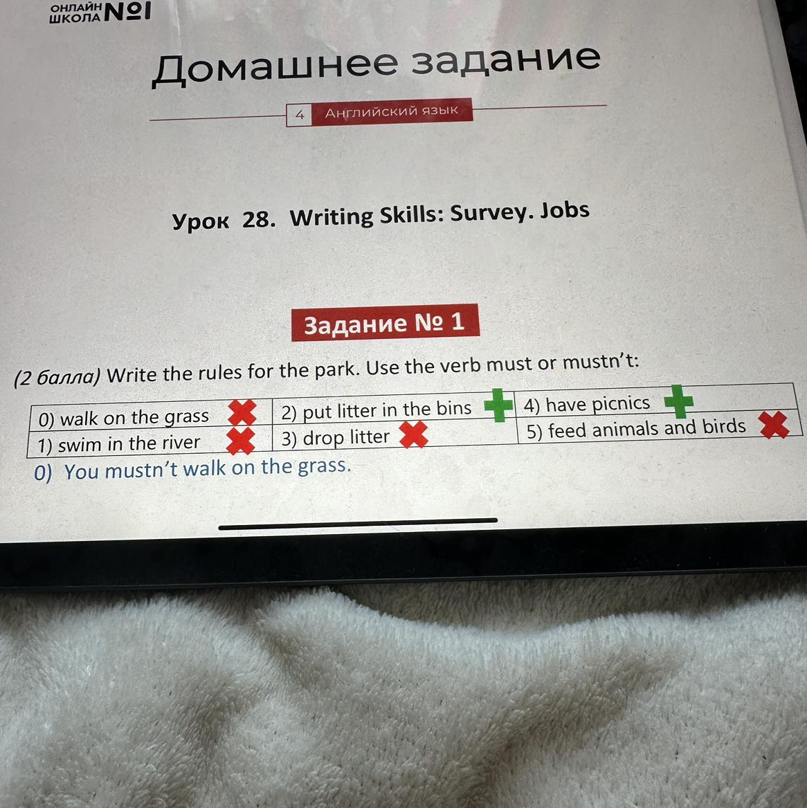 там где крестики означает что ты не должен это делать и там я использовала mustn't, и наоборот. Я использовала и другие местоимения помимо you