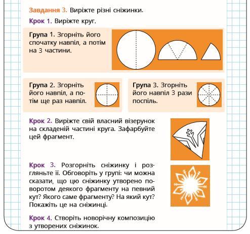 Робота над проєктом "Поворот" 1. Виконайте завдання 3 (доданий файл) для всіх груп (в кожного має бути три різні сніжинки) 2. Сфотографуйте або зафільмуйте кожен крок своєї роботи: 1) виріжте круг (три); 2) складіть кожен круг як розписано для кожної групи (три різні випадки); 3) виріжте свій власний візерунок на складеній частині круга, зафарбуйте тільки цей фрагмент (зробіть це для кожної із сніжинок); 4) розгорніть свої сніжинки. Чи можна сказати, що сніжинки утворені внаслідок повороту? Якщо так, то покажіть на сніжинках якої частини та на який кут. 5) утворіть композицію із сніжинок. Сфотографуйте або зафільмуйте результат своєї роботи. Бажаю успіхів!