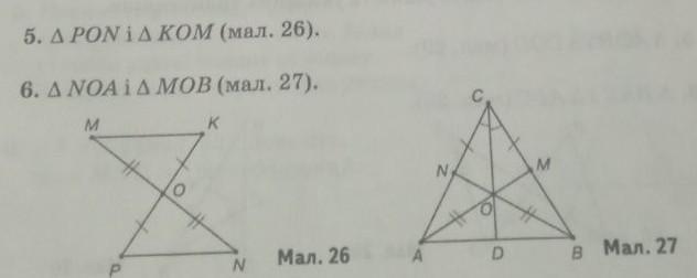 У задачах 5-6 доведіть рiвнiсть указаних трикутників. 5. ∆PON i ∆КОМ (мал. 26). 6. ∆ NOA i ∆ МОВ (мал. 27)
