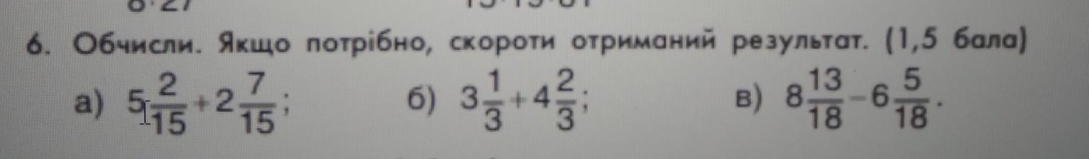 5. Обчисли. Якщо потрібно, скороти отриманий результат. а),5 2/15+2 7/15