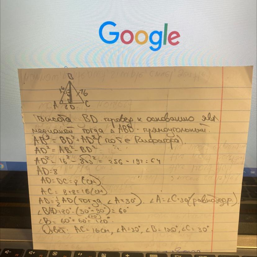 в равнобедренном треугольники ABC, с основанием AC боковая сторона AB=16см,а высота BD , проведённая к основанию равна 8√3 см. Найдите основание и углы треугольника