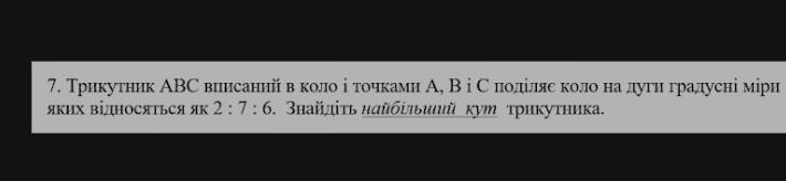 7. Трикутник ABC вписаний в коло і точками А, В і С поділяє коло на дуги градуснi мiри яких відносяться як 2 : 7 : 6. Знайдіть найбільший кут трикутника.