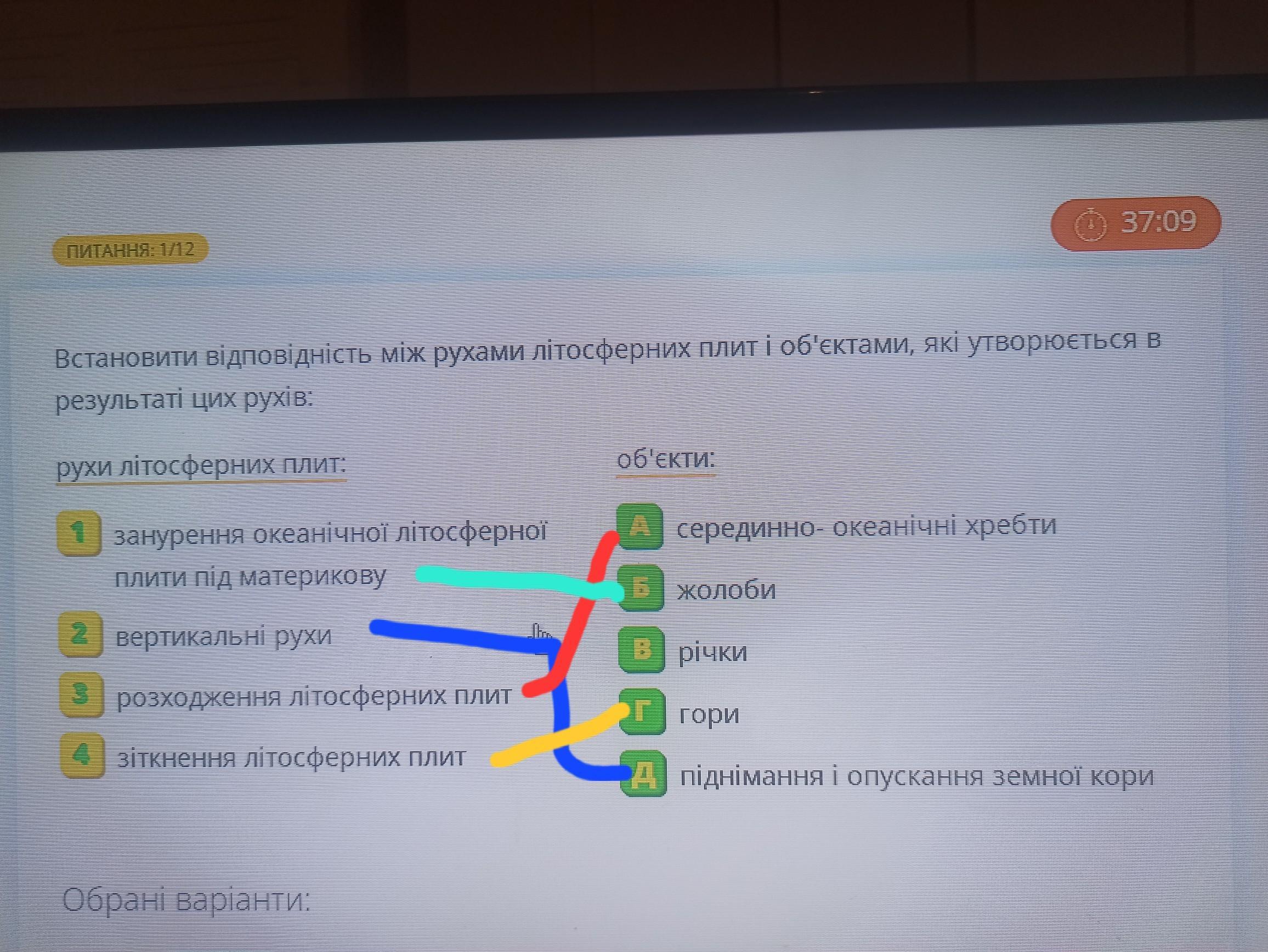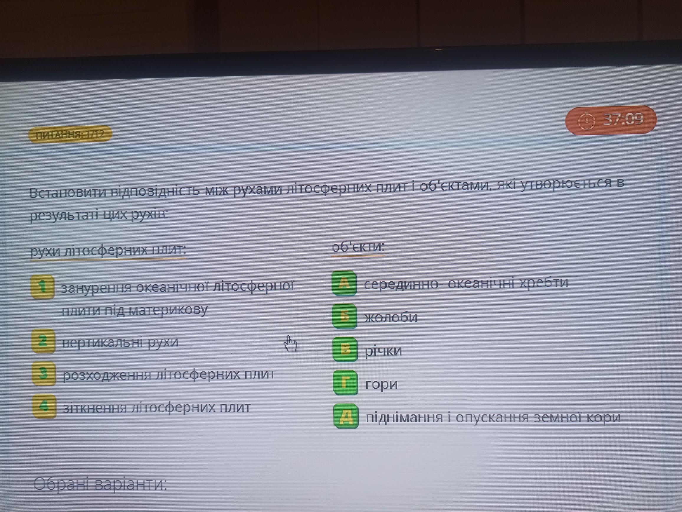 Встановити відповiднiсть мiж рухами літосферних плит і об'єктами, які утворюється в результаті цих рухів: рухи літосферних плит: 1 занурення океанічної літосферної плити під материкову вертикальні рухи розходження літосферних плит 2 3 4 зіткнення літосферних плит Обрані варіанти: Ви ще не обрали жодної відповідності об'єкти: А серединно-океанічні хребти Б жолоби 38:3 в річки Г гори Д піднімання і опускання земної кори