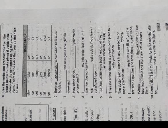 1 check out 2 top up 3 looked after 4 goes off 5 fell out 6 hang out 7 take up 8 have been getting on 9 going on 10 had found out