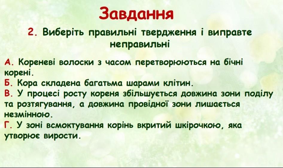 Завдання 2. Виберіть правильні твердження і виправте неправильні А. Кореневі волоски з часом перетворюються на бічні корені. Б. Кора складена багатьма шарами клітин. В. У процесі росту кореня збільшується довжина зони поділу та розтягування, а довжина провідної зони лишається незмінною. Г. У зоні всмоктування корінь вкритий шкірочкою, яка утворює вирости.
