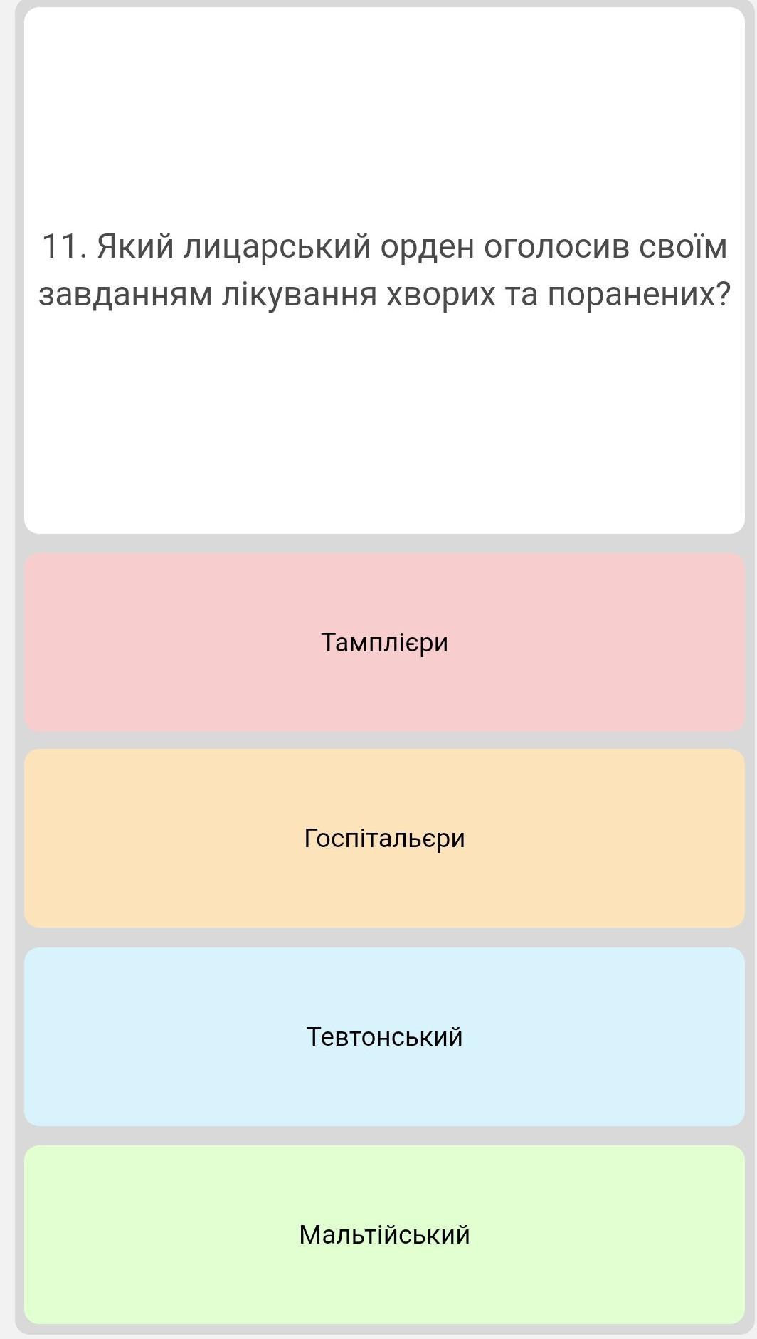 11. Який лицарський орден оголосив своїм завданням лікування хворих та поранених?