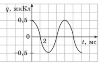 2)Заряд на обкладках конденсатора коливального контуру змінюється за графіком (див. рис.). Визнач амплітудне значення заряду, період та частоту вільних електромагнітних коливань у контурі.