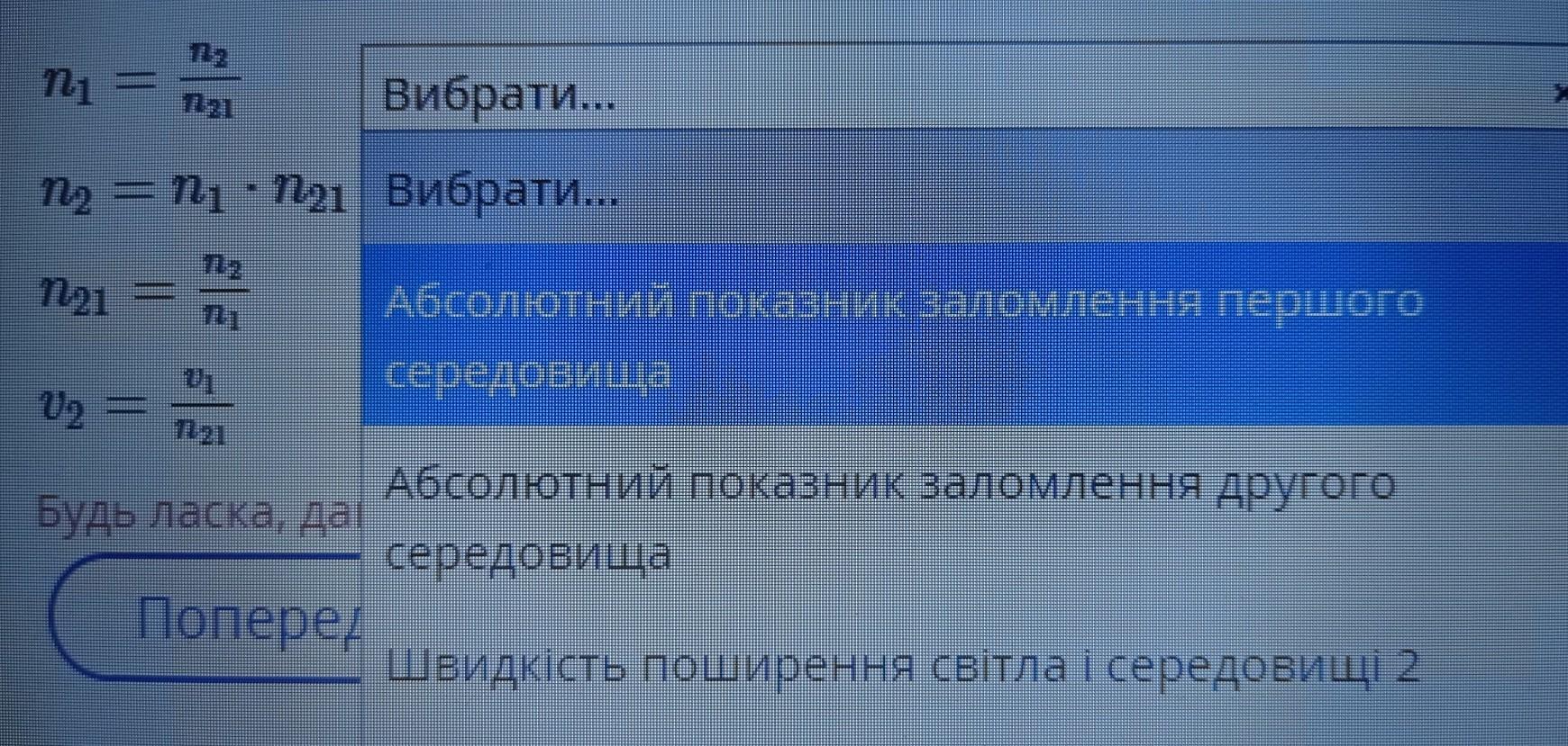 4 варіант: відносний показник заломлення (показник заломлення середовища 2 відносно середовища 1)