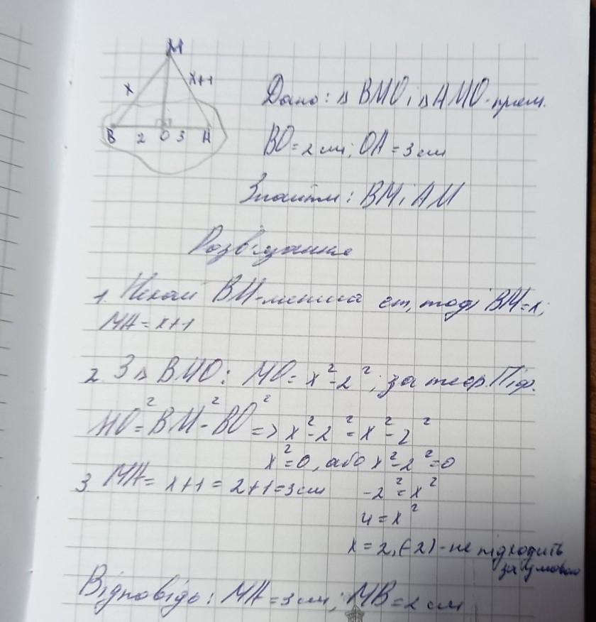 СРОЧНО, 20 БАЛЛОВ з точки до площини проведено дві похилі , одна з яких на 1 см довша за другу . Проекції похилих дорівнюють 2 см і 3 см . Знайдіть довжину похилих .