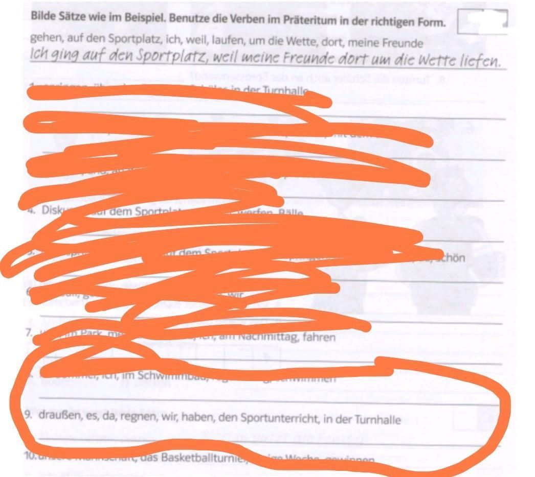 9. Drauben, es, da, regnen, wir, haben, den Sportunterricht, in der Turnhalle.