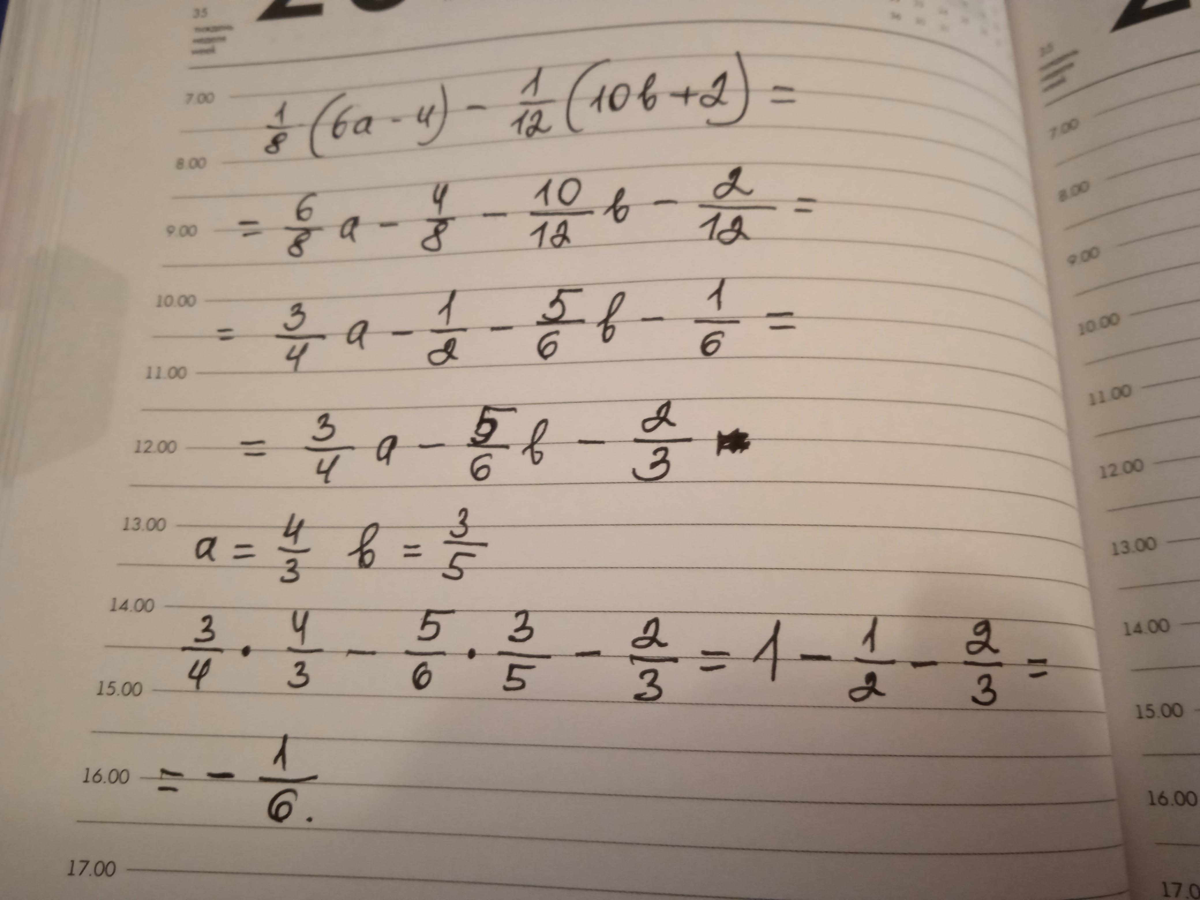 = 3/4a - 1/2 - 5/6b - 1/6 = 3/4a - 5/6b - 2/3 ; 3/4 * 1 1/3 - 5/6 * 3/5 - 2/3 = 1 - 1/2 - 2/3 = 1 - 7/6 = -1/6