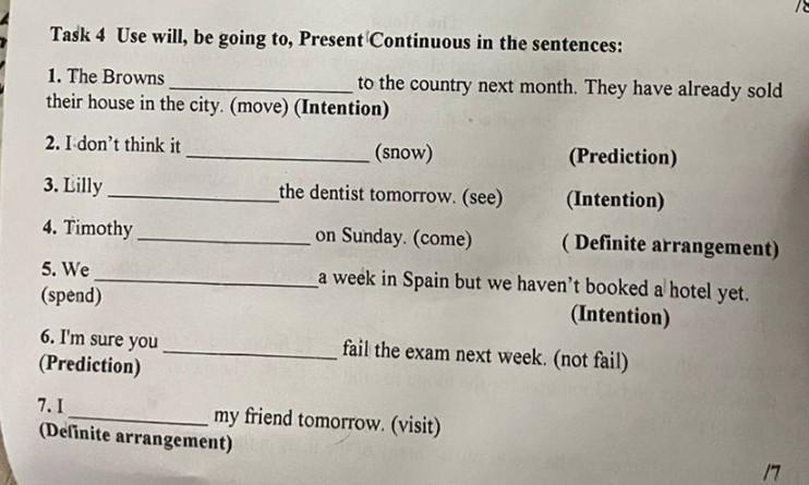 Ответ:1)will move 2)is snowing 3)will see 4)will come 5)are spending 6)will not fail 7)will