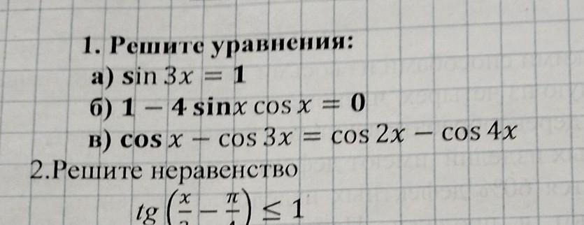 Решите уравнения: a) sin 3x = 1 б) 1-4 sinx cos x = 0 B) COS X cos3x = cos 2x cos 4x