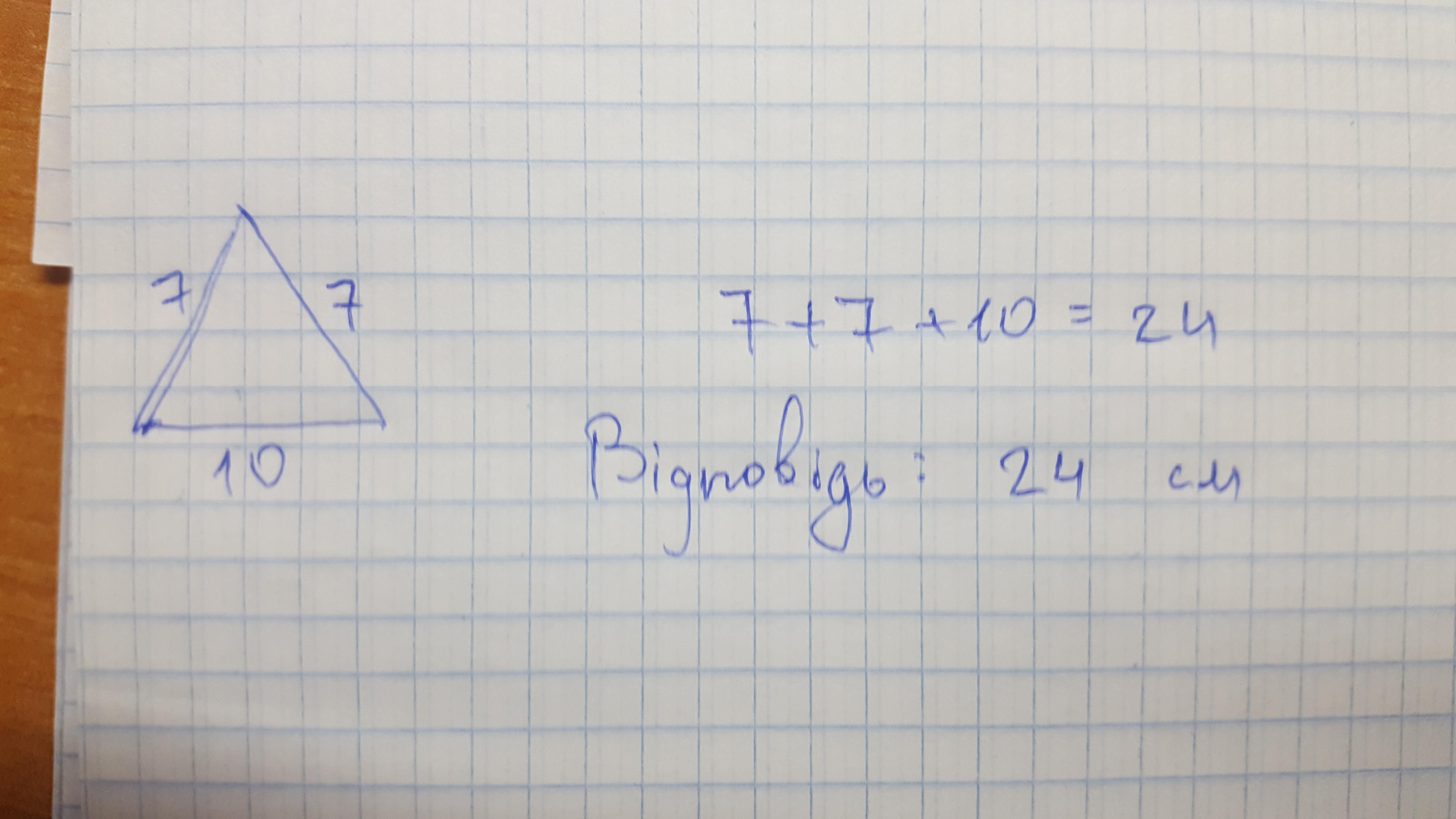 Знайдіть периметр рівнобедреного трикутника, основа якого дорівнює 10 см, а бічна сторона ‒ 7см.