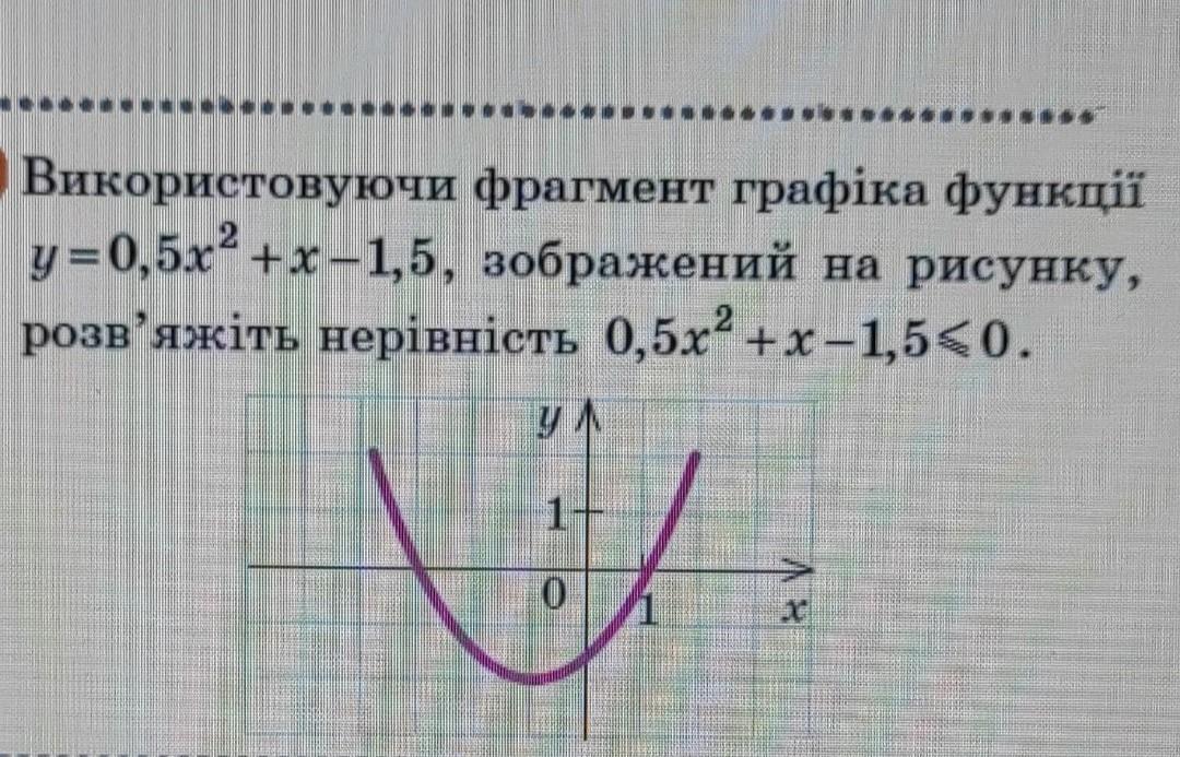 х=1, другой легко найти по теореме Виета, -1.5/0.5=-3, нас интересует та часть графика, которая лежит ниже оси ОХ, либо на оси ОХ. т.к. сказано, что надо решить нестрогое неравенство меньше или равно нулю. Поэтому ответ находится с.о. : х∈[-3;1]