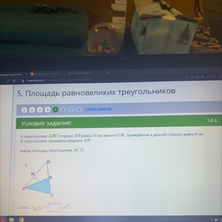 В треугольнике ABC сторона AB равна 14 см, высота СМ, проведённая к данной стороне, равна 6 см.